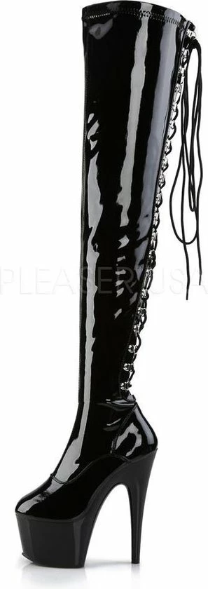 Pleaser. Een glanzende zwarte overknee lak laars met een plateau, stiletto hak, veters aan de achterzijde en een ritssluiting aan de zijkant.