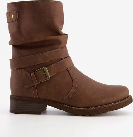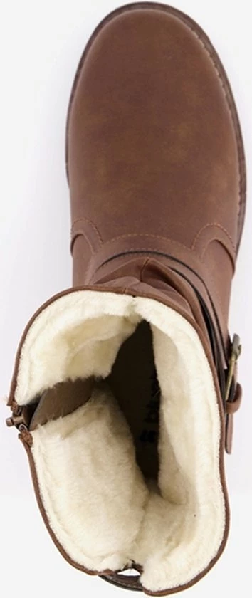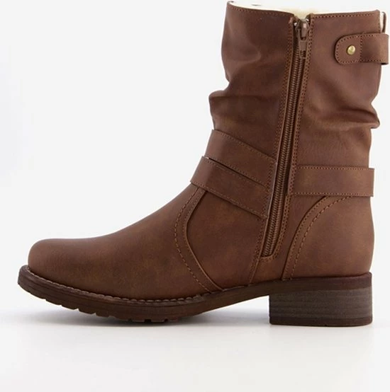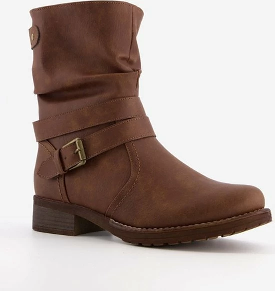 Cognac bruine enkellaarsjes voor dames van Blue Box. Gemaakt van imitatieleer, een binnenwerk van textiel en een stevige profielzool. De laarsjes hebben een ritssluiting aan de binnenzijde en een decoratieve gesp rondom de voet. De vaste binnenzool is gemaakt van textiel. De enkellaarsjes hebben een schachthoogte van 19 cm en een laag hakje van circa 2 cm.