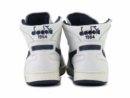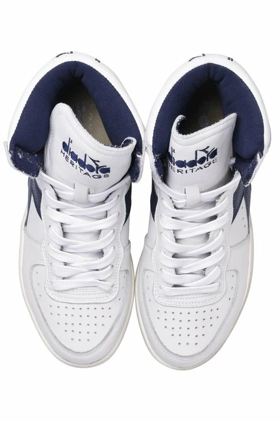 Hoge wit leren vintage look sneaker voor dames van het Italiaanse merk Diadora Heritage. Deze hoge runner met perforaties op de ronde neus is uitgevoerd in wit leer met blauwe accenten. De binnenvoering is van comfortabele stof, het uitneembare voetbed van leer is te vervangen door een persoonlijke inlegzool. Een stevig contrefort draagt bij aan het comfort. Verder heeft de beige met blauw rubberen loopzool een grof profiel voor een stevige grip.