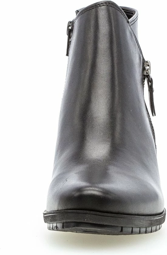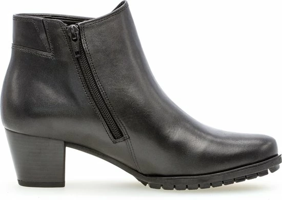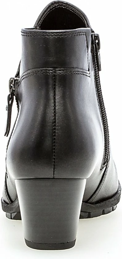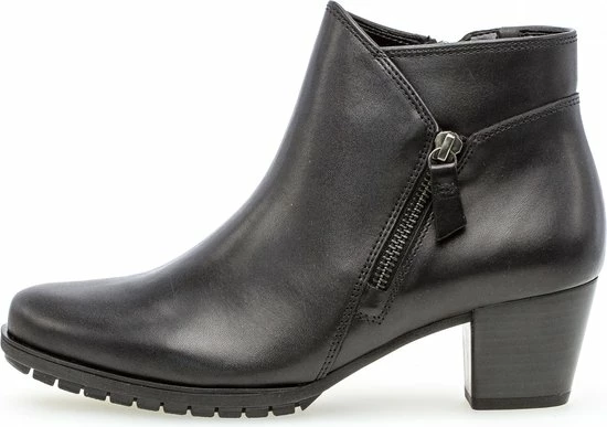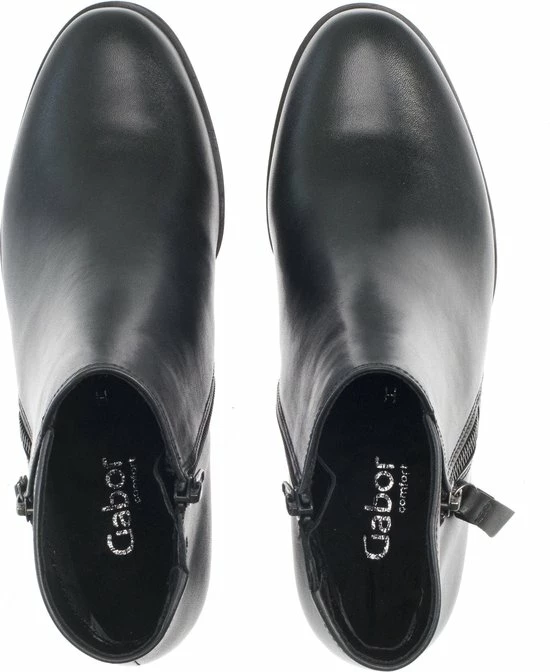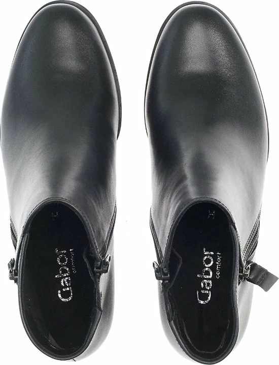 Zwarte Gabor enkellaarsjes in mooi kalfsleer, voor een zacht materiaal met een subtiele glans. De laarsjes hebben een 45mm hoge hak, waar je dankzij de comfortabele extra wijdte bij de tenen, bal en wreef heerlijk op loopt. De sierrits en de extra ritssluiting zien er prachtig uit en maken aantrekken makkelijker.