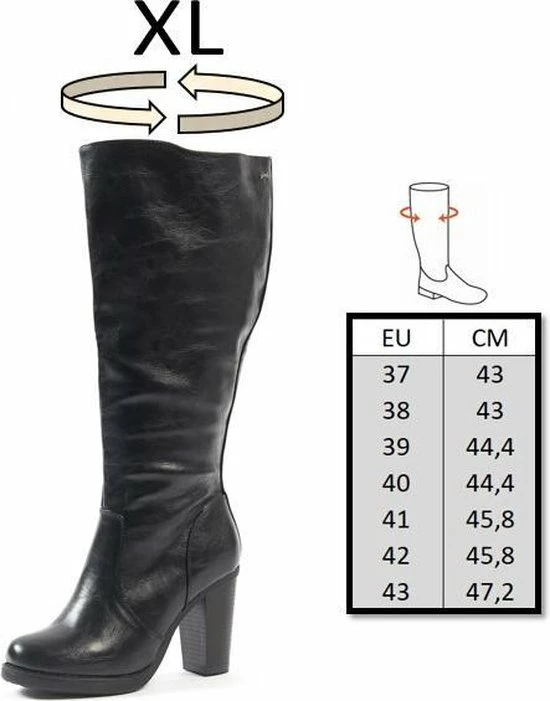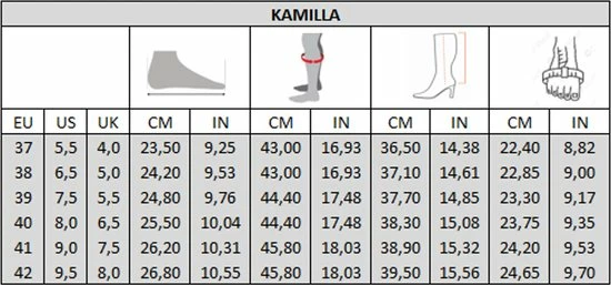 Onze Kamilla-laarzen hebben een hak van 9 cm en zijn ontworpen voor de stad met hun chique en elegante kant. Het Belgische design en het comfort dat we aan elk van onze creaties verlenen, vinden we vooral terug met een elastische band aan de bovenkant van de laars. Ons Kamilla-model is ontworpen voor grote kalveren – XL, tussen 43 en 47,20 cm. De gebogen en uitneembare binnenzool garandeert optimaal comfort en stelt je in staat om je eigen orthopedische inlegzolen te gebruiken. Met dit paar laarzen voel je je mooi en comfortabel.
