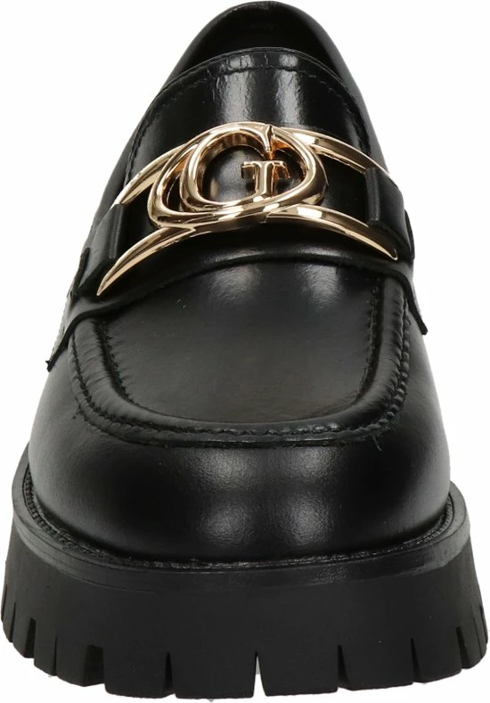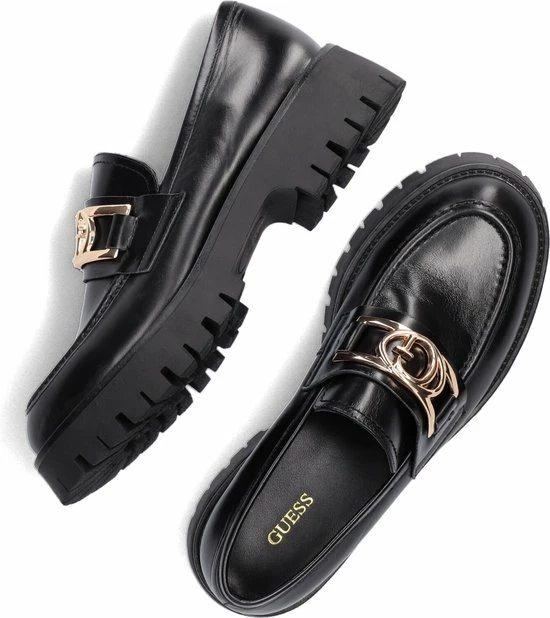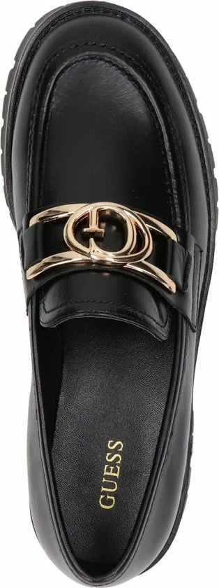 Guess Ilary instapschoen. Guess steekt de klassieke loafer in een modern jasje met dit model. Vervaardigd uit stevig leer met op de band het G-logo van Guess. De leren voering houdt door het ademende effect de voeten op aangename temperatuur. De grove profielzool is gemaakt van thermoplastisch rubber en biedt grip en stabiliteit.