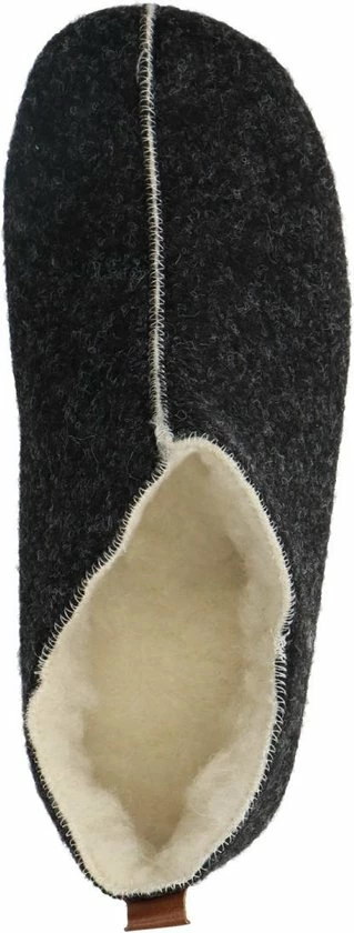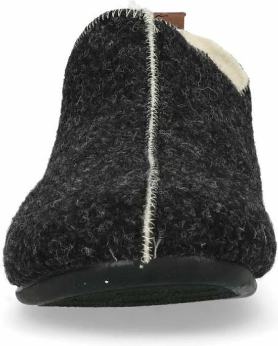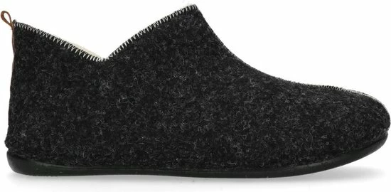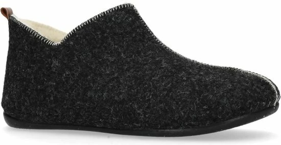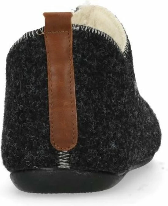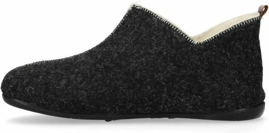 Donkergrijze pantoffels van het merk Manfield. De pantoffels zijn erg zacht van binnen, doordat de gehele binnenkant is gemaakt van imitatie wol. Deze pantoffels bedekken de gehele voet, zodat de voeten extra warm blijven. Een leuk detail is de cut-out bij de enkels en de bruine streep op de achterzijde van de pantoffels. Ideaal om binnenshuis te dragen, maar door de rubberen zool kunnen deze huisschoenen ook prima rondom het huis gedragen worden. Goed om te weten: de leerdetails van de pantoffels kunnen per artikel verschillen.