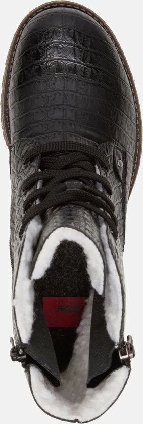 Deze zwarte Rieker veterboots lopen, zoals we van het merk gewend zijn, super comfortabel. Door het Rieker Antistress-systeem zijn de schoenen lichter en flexibeler en geniet je van demping tijdens het lopen. Dit model is gemaakt van synthetisch materiaal en heeft een trendy krokodillenprint. De schoenen hebben een warme voering van textiel, ideaal voor de koudere maanden! De ritsen aan de zijkanten zijn niet alleen ter decoratie, hiermee kan je ook makkelijk in en uit de schoenen stappen. De zool met gleuven is van PU materiaal. De zwarte Rieker veterboots hebben een F-leest, waardoor ze geschikt zijn voor de smallere voeten.