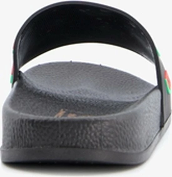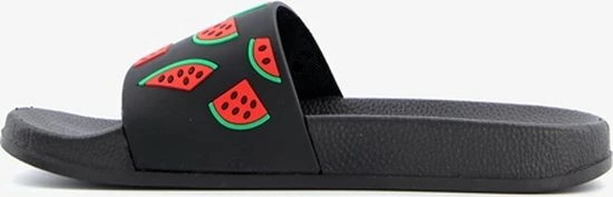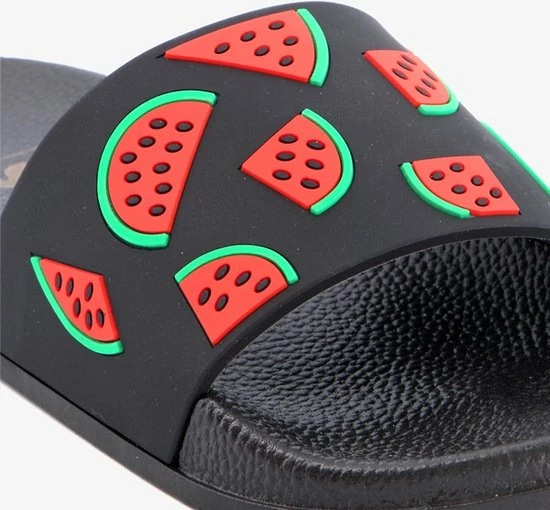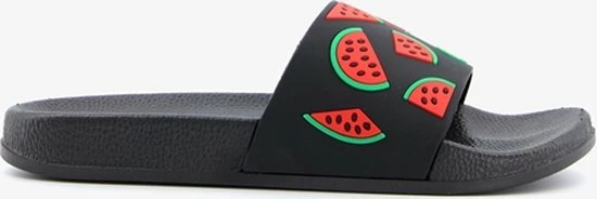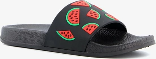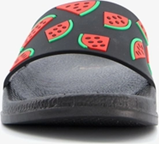 Zwarte badslippers met watermeloenen op de band voor dames. Voorzien van een comfortabel voetbed. De badslippers hebben een stevige, rubberen zool met voorgevormde groeven voor extra comfort.