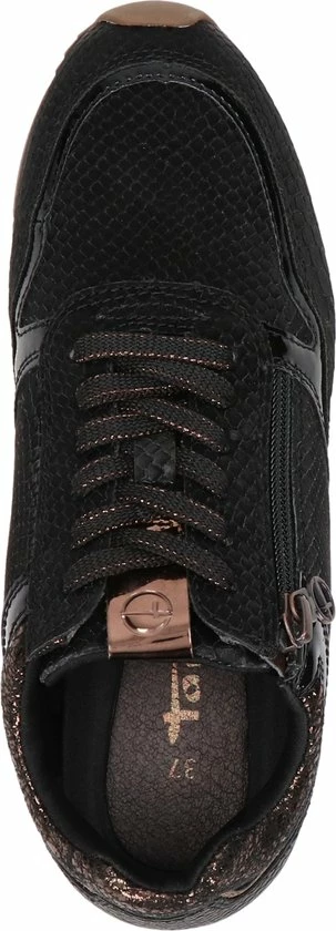 Deze zwarte Tamaris sneakers zijn gemaakt van imitatieleer. Ter decoratie zijn deze sneakers voorzien van een schubbenpatroon en verschillende metaalkleurige inzetten. Ook de voering is van imitatieleer gemaakt en de binnenzool van textiel, wat zorgt voor een zacht en comfortabel gevoel. Door de veters in combinatie met de rits stap je snel en gemakkelijk in en uit deze sneakers. De zool is gemaakt van rubber en heeft een hoogte van 2 centimeter.