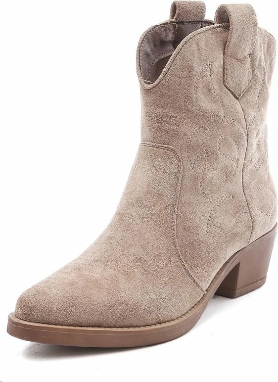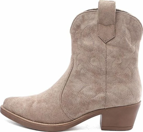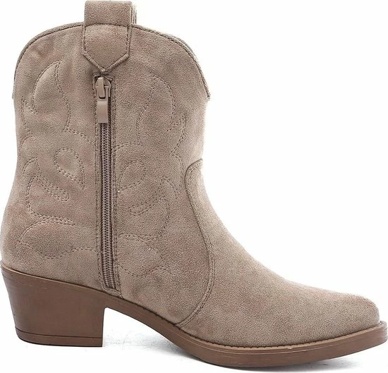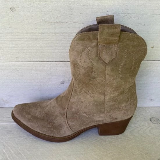 Taupe Khaki korte suedine cowboylaarzen voor dames. Laarzen met stiksels afgewerkt met bruine zool. Verkrijgbaar in maat 36 t/m 41. Instaprits aan binnenzijde.