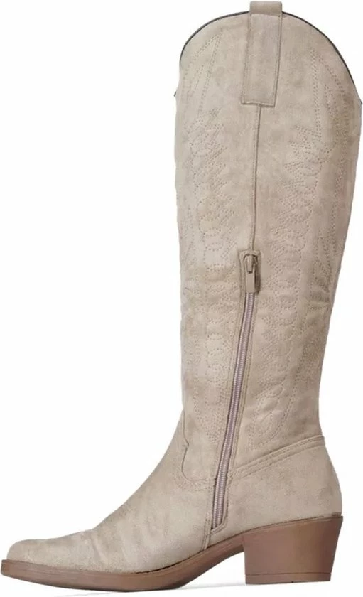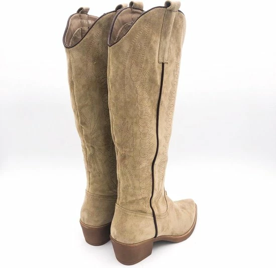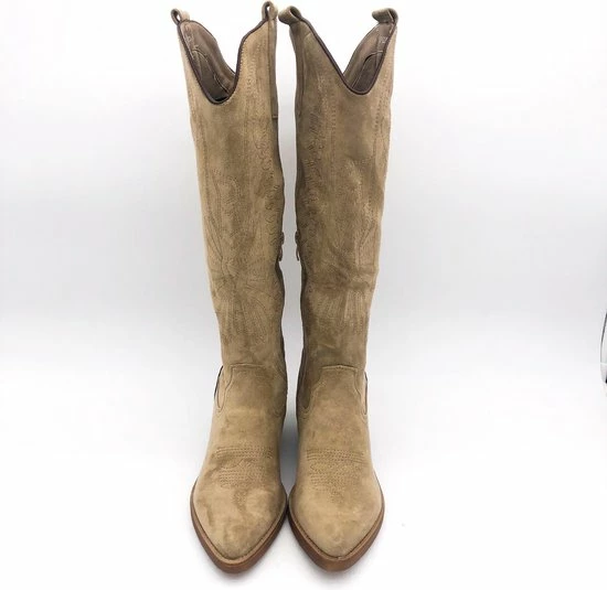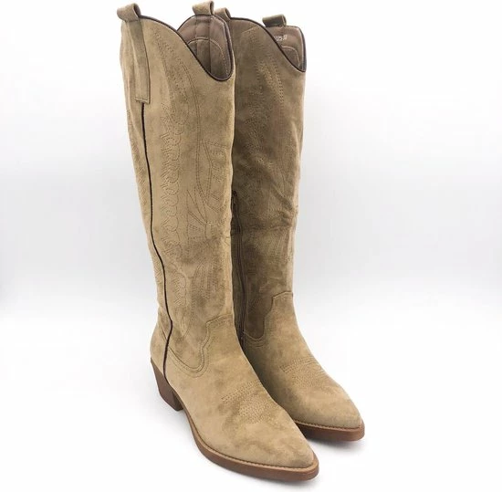 Taupe Khaki hoge suedine cowboylaarzen voor dames. Laarzen met stiksels afgewerkt met bruine zool. Verkrijgbaar in maat 36 t/m 41. Instaprits aan binnenzijde.